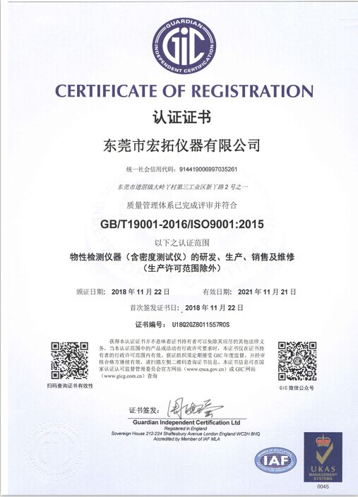 宏拓儀器通過ISO9001:2015質量體系管理認證,通過國家計量測試中心全面質量與性能檢測,獲得國家計量器具型式批準CPA證書,參與起草制定: 【GB/T 1040.1-2025塑料 拉伸性能的測定】、【GB/T 1634.1-2025塑料 負荷變形溫度的測定】、【GB/T 44559.1-2024塑料 硬質塑料沖孔性能的測定】 、【GBT 43139-2023鑄造鋁合金液減壓凝固試樣密度檢測】......等標準。